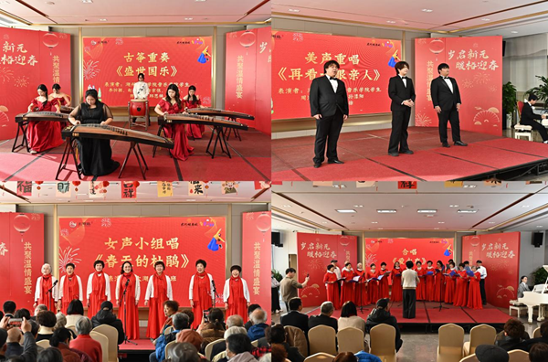 揭牌仪式后,一场以“高校联谊,共庆元旦”为主题的太湖椿跨年共聚盛宴音乐康养体验活动拉开帷幕。社区长者、音乐学院、健康职业学院三方联袂献艺,用歌声、器乐与互动游戏传递音乐的治愈力量。高校学子展现出学院风采联动的专业与热情,音乐学院学生以古筝重奏《盛世国乐》开场,琴音恢宏,赢得满堂掌声;健康职业学院学生带来的朗诵表演《觉醒》,仿佛穿越百年时空,回到风雨如晦热血沸腾的年代,让我们感受到先辈为民族觉醒发出的呐喊。鑫颐·太湖椿的长者为我们带来了戏曲合唱《老年朋友想穿点》、萨克斯合奏《中国人民解放军军歌》等精彩节目,其中萨克斯合奏是由几位80多岁的高龄老人组成的乐队,他们精彩的演出洋溢着银龄风采展示的活力与感动。现场欢声笑语不断,乐声与掌声交织,勾勒出“音乐康养”赋能美好生活的生动图景。