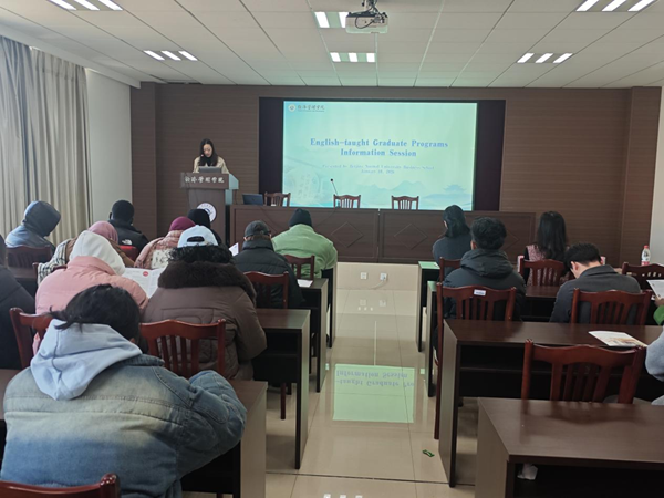 为拓展学院国际学生在华发展路径,助力国际学生把握在华高质量深造机遇,1月10日上午,北京师范大学经济与工商管理学院办公室主任王玮与国际认证办公室副主任李婧雅应邀来经济管理学院开展国际学生硕博英文授课项目专场宣讲会。经济管理学院党委副书记周颖、国际学生负责老师及百余名留学生到场参与,宣讲会由周颖主持。
