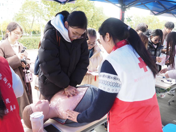 在互动体验区,医学院(护理学院)开展急救知识科普与实操演练,志愿者手把手教授心肺复苏、创伤包扎等应急技能,让现场学生身临其境感受到急救体验。各学院围绕雷锋精神主题开展了不同的打卡活动,活动现场氛围热烈,吸引过往师生纷纷驻足观看、积极参与、点赞交流。
