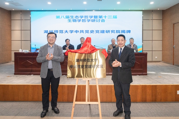 开幕式上,副校长舒志定在致辞中表示,作为“绿水青山就是金山银山”理念诞生地的高校,学校始终坚持“因地制宜、体现特色、服务地方”的办学方针,扎根湖州大地,全面践行“两山”理念,持续推动多学科交叉研究,为生态文明建设提供智力支撑与实践探索。生态学哲学专业委员会主任肖显静教授在致辞中指出,生态学哲学研究不仅要关注生态系统的内在价值,还应立足中国生态文明建设的生动实践,不断深化哲学反思。生物哲学专业委员会主任赵斌教授在致辞中表示,生物学哲学应积极回应生物多样性保护、生态系统修复等现实议题,为生态文明建设提供坚实的学理支撑。开幕式上,还举行了中共党史党建研究院揭牌仪式。