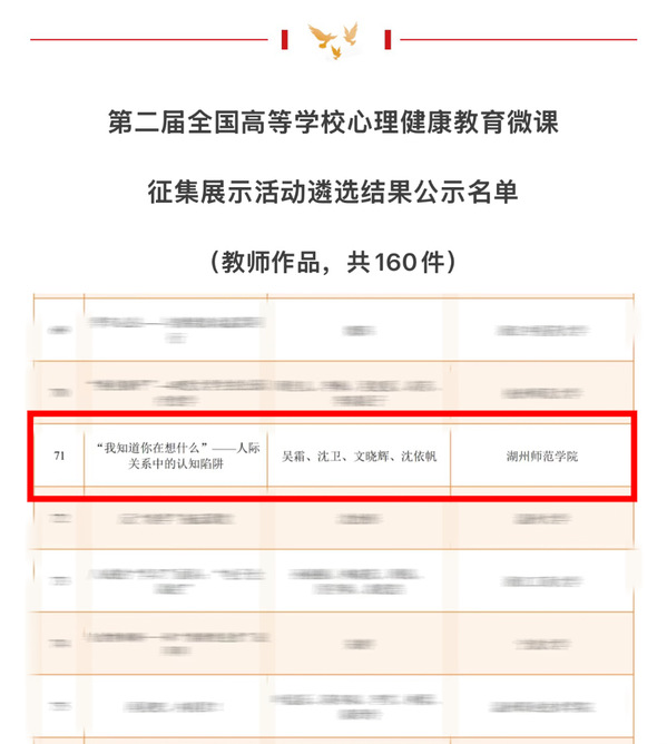 4月20日,由教育部思想政治工作司指导、普通高等学校学生心理健康教育专家指导委员会主办、中国大学生在线承办的第二届全国高等学校心理健康教育微课征集展示活动遴选结果正式公示。我校报送的心理健康教育微课作品《“我知道你在想什么”——人际关系中的认知陷阱》从全国2806件参赛作品中脱颖而出,成功入选。