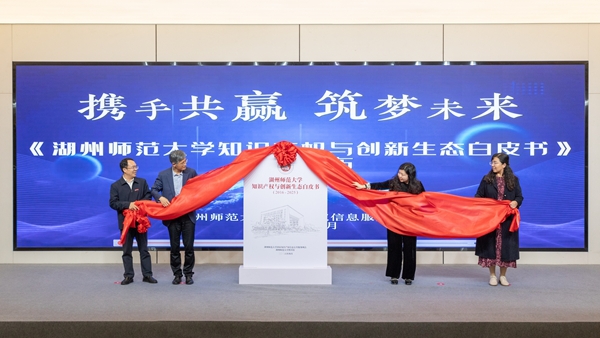 我校图书馆负责人介绍了本届读书节的主要活动安排。活动现场,发布了《湖州师范大学知识产权与创新生态白皮书(2016-2025)》。