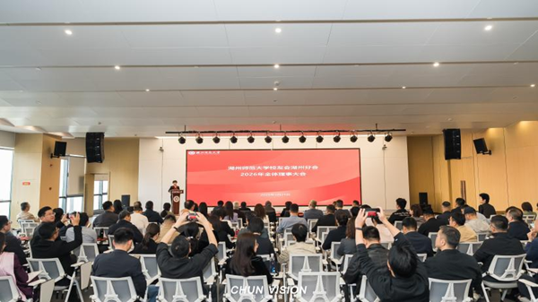 4月25日下午,湖州师范大学校友会湖州分会召开2026年全体理事大会。校党委副书记张国英,校友总会副会长朱鸿,湖州市政协原党组副书记、副主席叶理中校友,湖州市人大原副主任胡国荣校友出席,校友办负责人、湖州分会全体理事和校友代表参加。